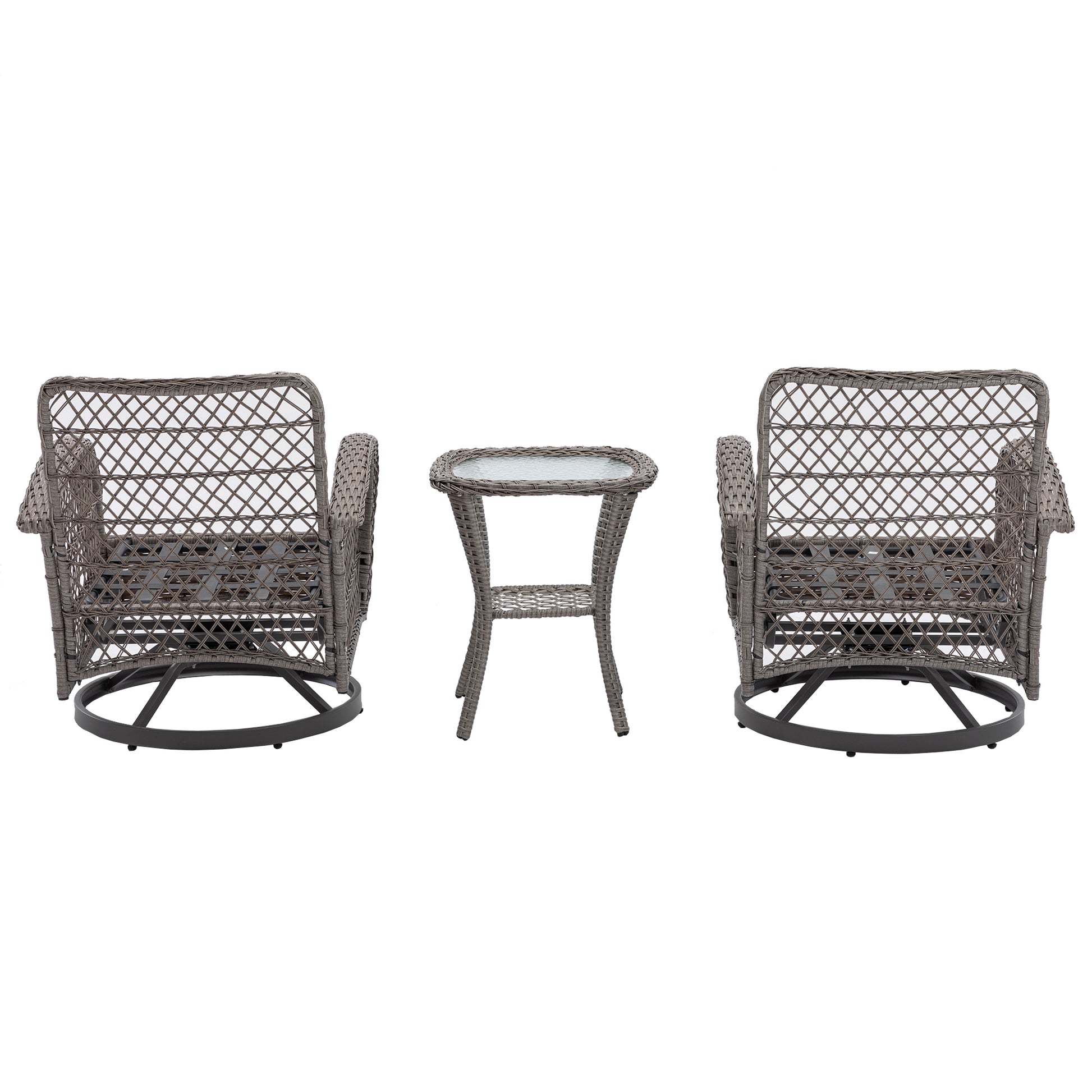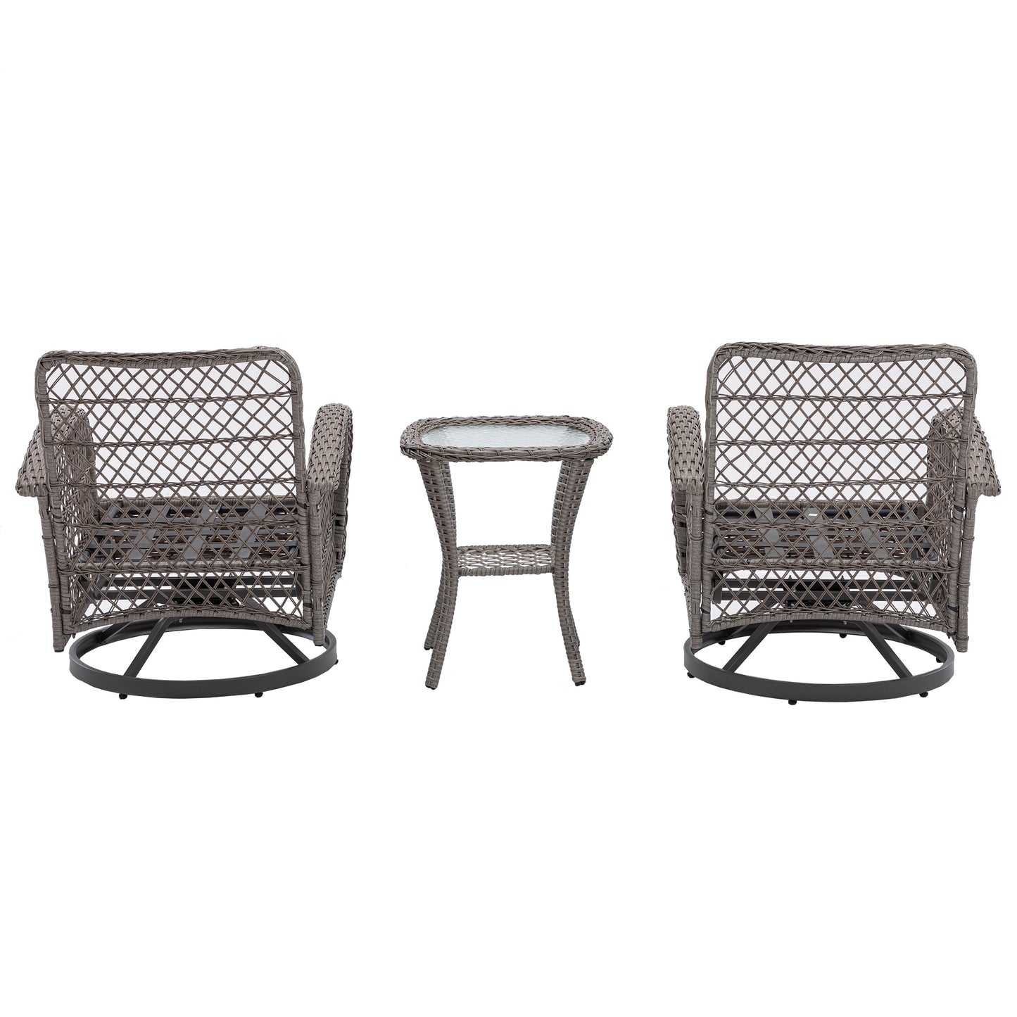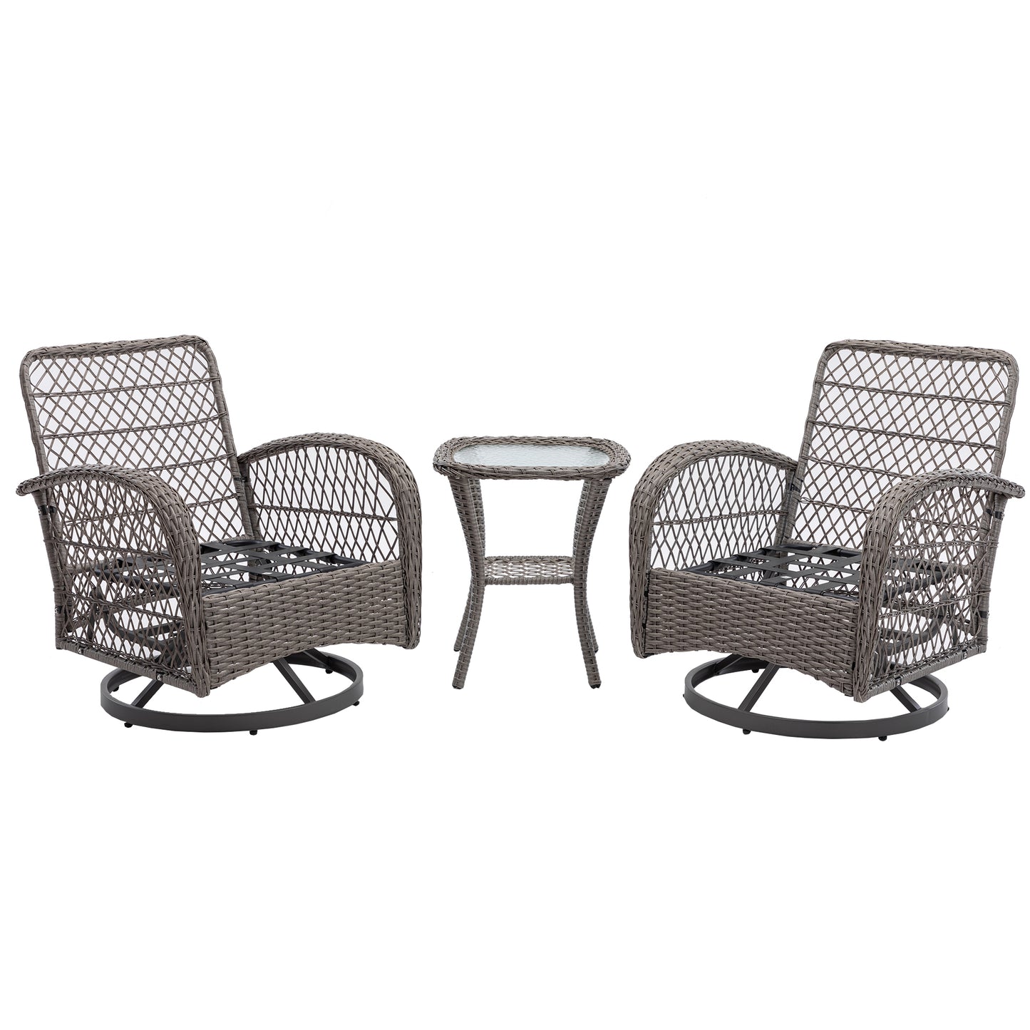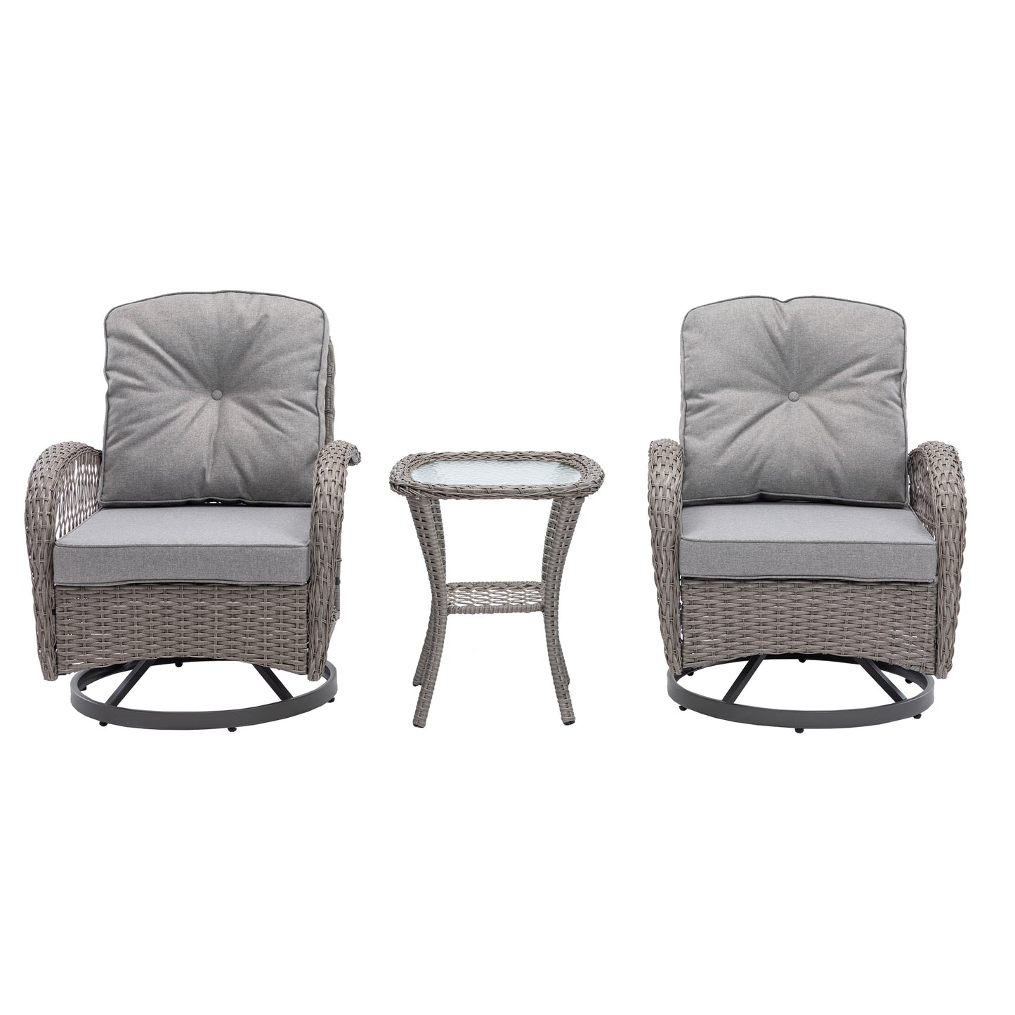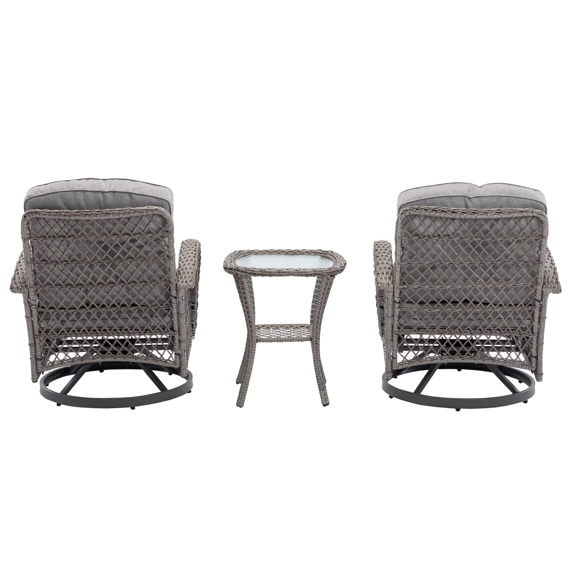 3 Pieces Outdoor Swivel Rocker Patio Chairs, 360 Degree Rocking Patio Conversation Set with Thickened Cushions and Glass Coffee Table for Backyard, Grey