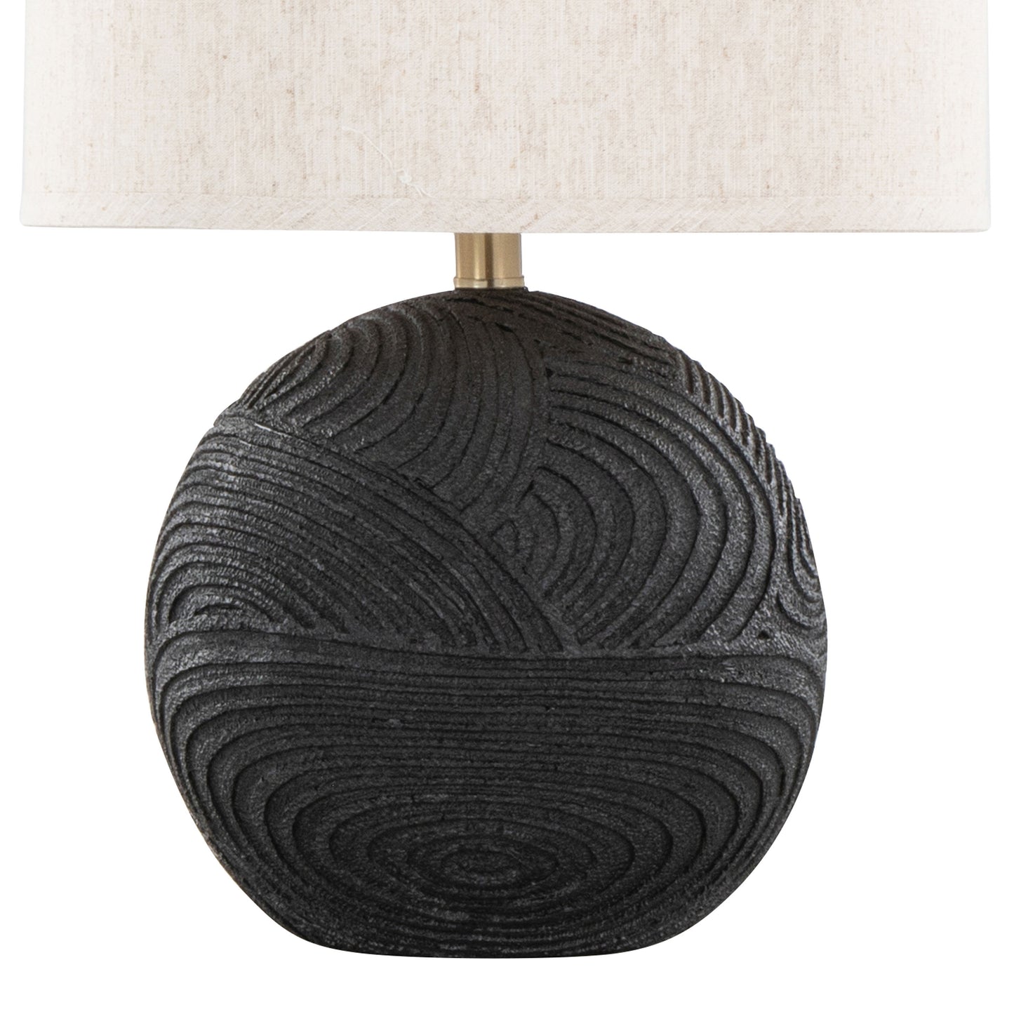 - Elevate your space with the Kona Table Lamp from Grandview Gallery by LumiSource, the epitome of contemporary chic. This polyresin table lamp is accented with modern brass details, exuding an air of sophistication. Its intricately grooved base, harmonizes flawlessly with the natural linen drum shade, casting a warm, inviting glow. Elevate your space with impeccable style and craftsmanship.