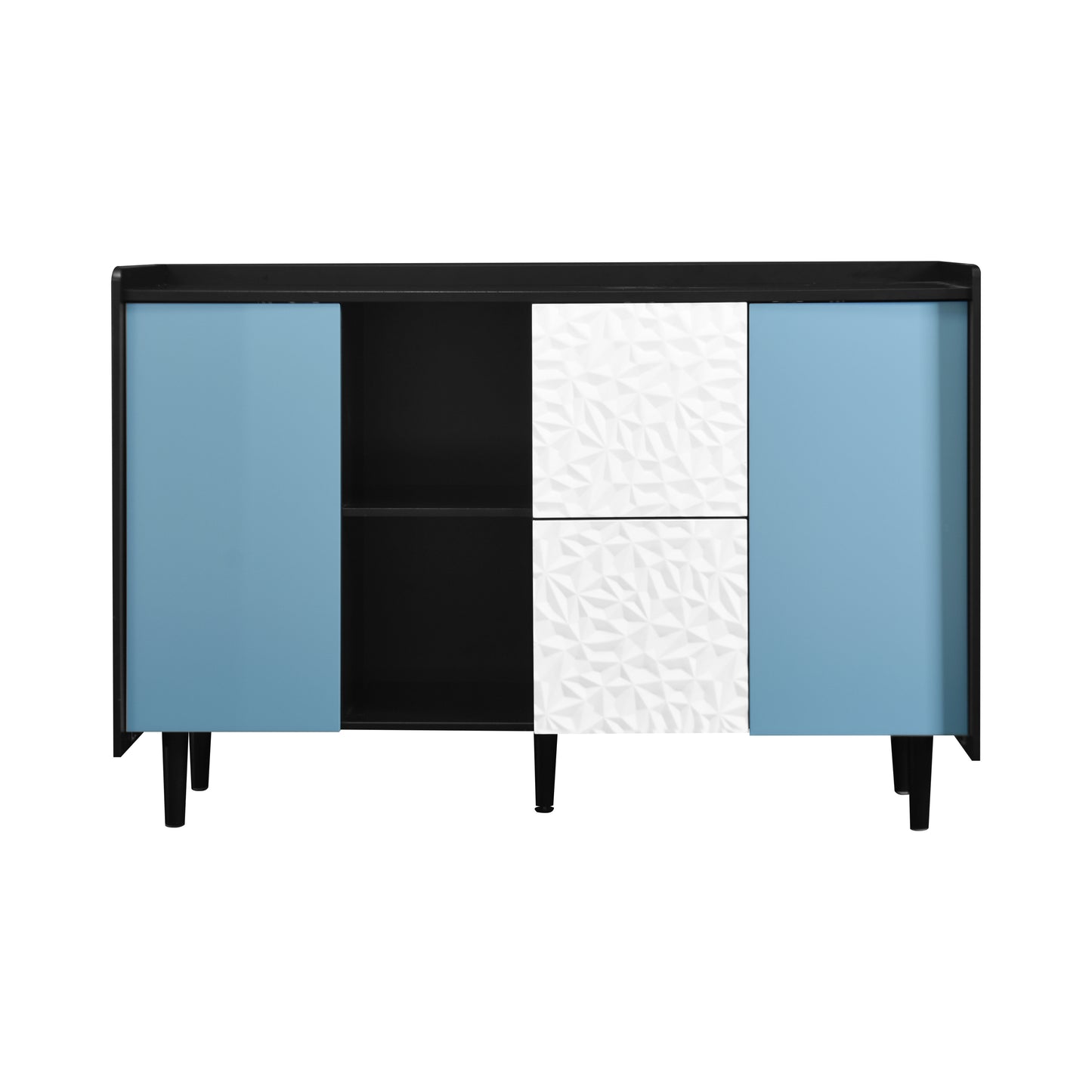 Sideboard Buffet Cabinet, Black Storage Cabinet with Blue Doors , 2 Drawers with unique panel styling and 2 Open Storage Compartment, Modern Coffee Bar Cabinet Accent Cabinet for Kitchen, Dining Room,