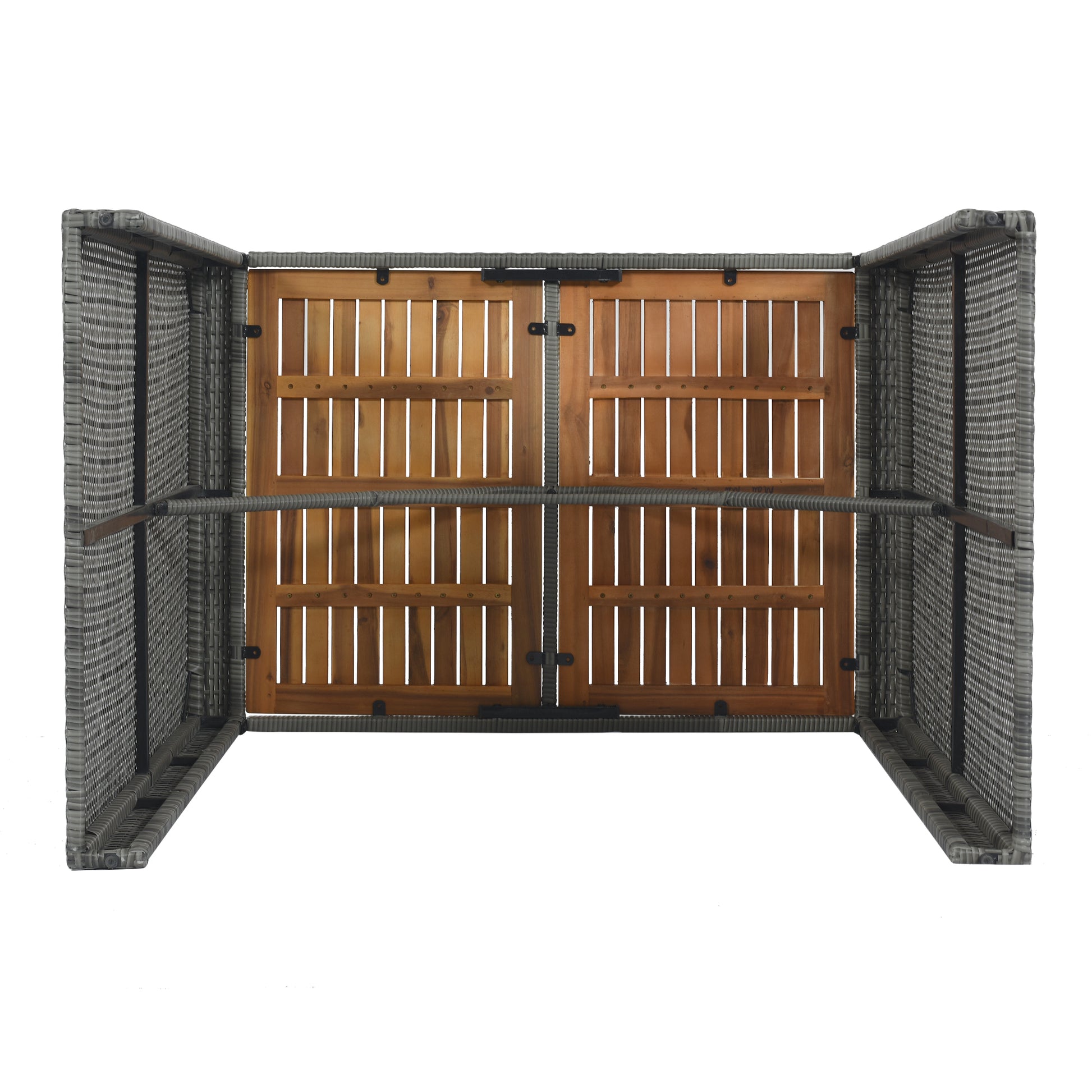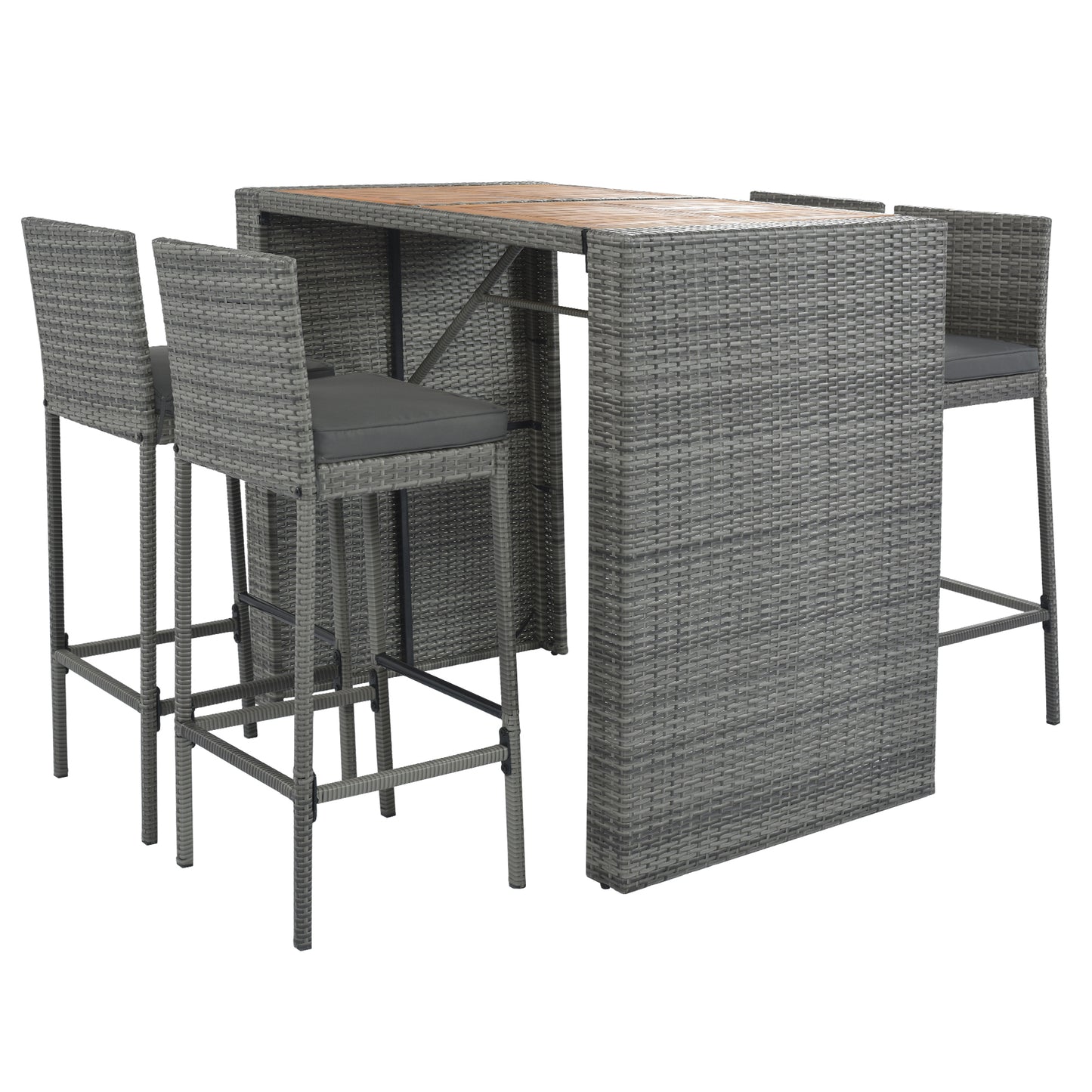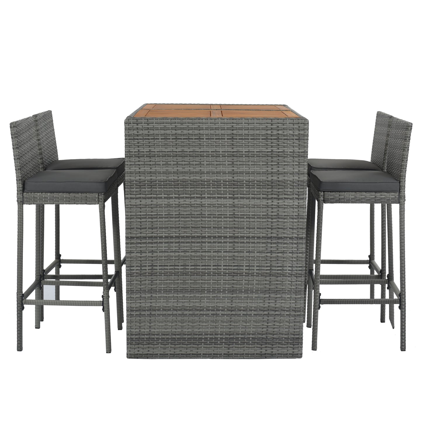 GO 5-pieces Outdoor Patio Wicker Bar Set, Bar Height Chairs With Non-Slip Feet And Fixed Rope, Removable Cushion, Acacia Wood Table Top, Brown Wood And Gray Wicker
