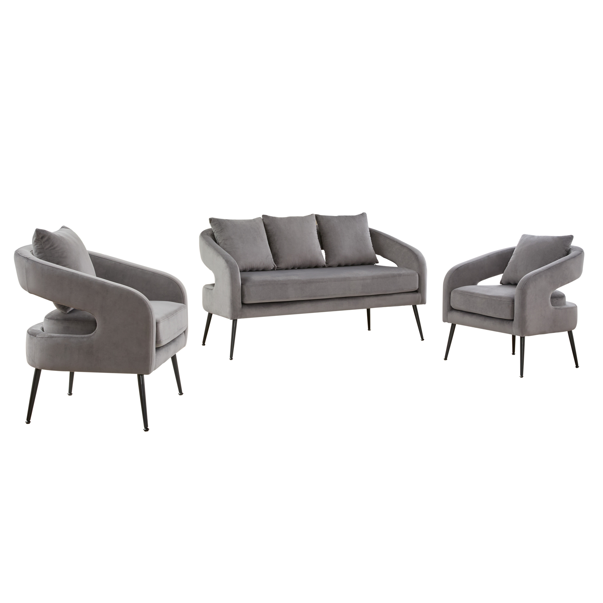 Mid Century Modern Velvet 3-Piece Living Room Set with Metal Legs in Charcoal, Loveseat & 2 Accent Chairs, Upholstered in Soft Velvet, Solid Wood Frame, Round Arms, Black Metal Legs