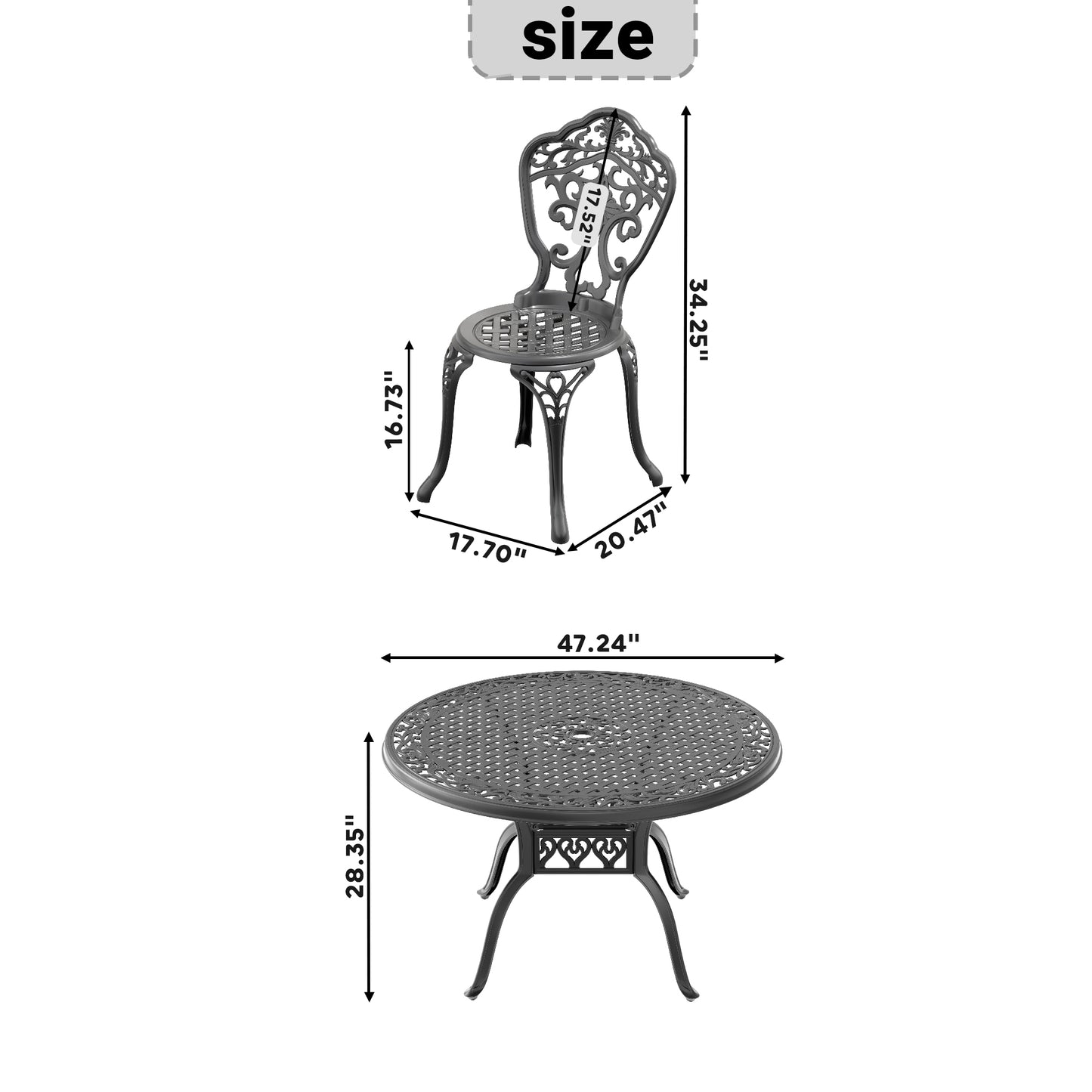 - Traditional casting process is used to produce chairs and tables with exquisite carved lines or various patterns such as petals and rectangles, presenting an elegant and beautiful appearance. This design eliminates monotony and adds a touch of charm to your outdoor space, creating a delightful atmosphere for dining and relaxation.