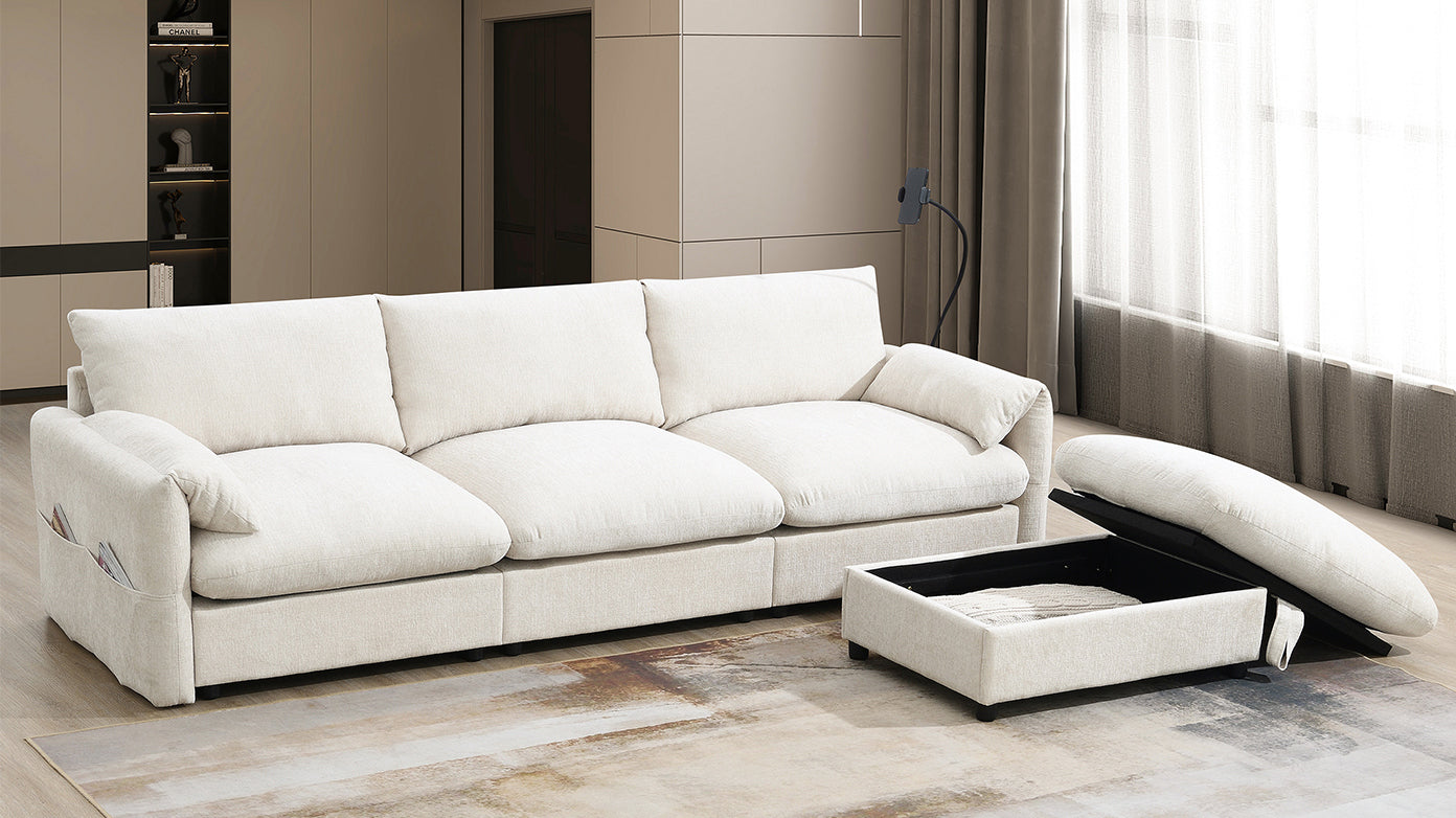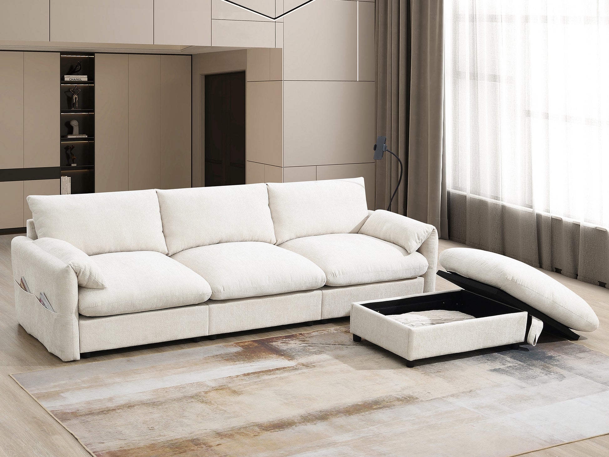 The sofa features an exceptionally large 32.5-inch ottoman that offers both comfort and practicality. This multifunctional piece can be used as a footrest or extra seating while also providing hidden storage space.