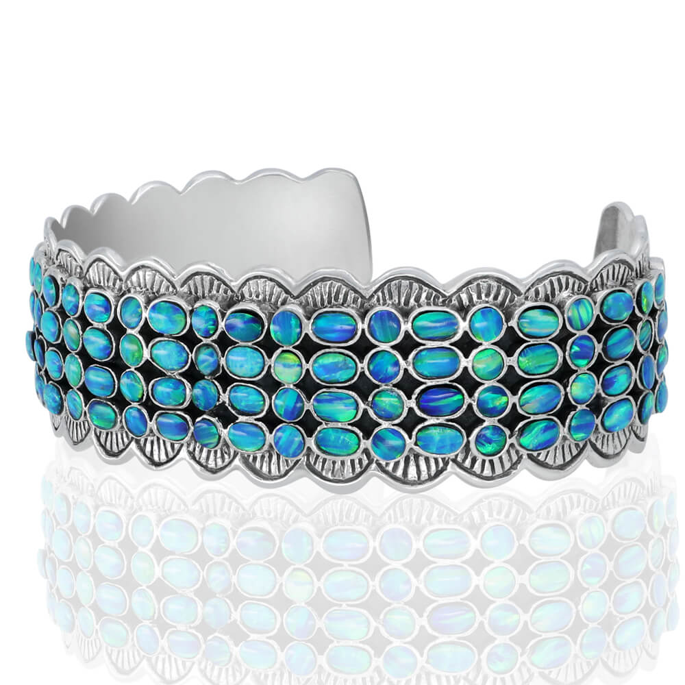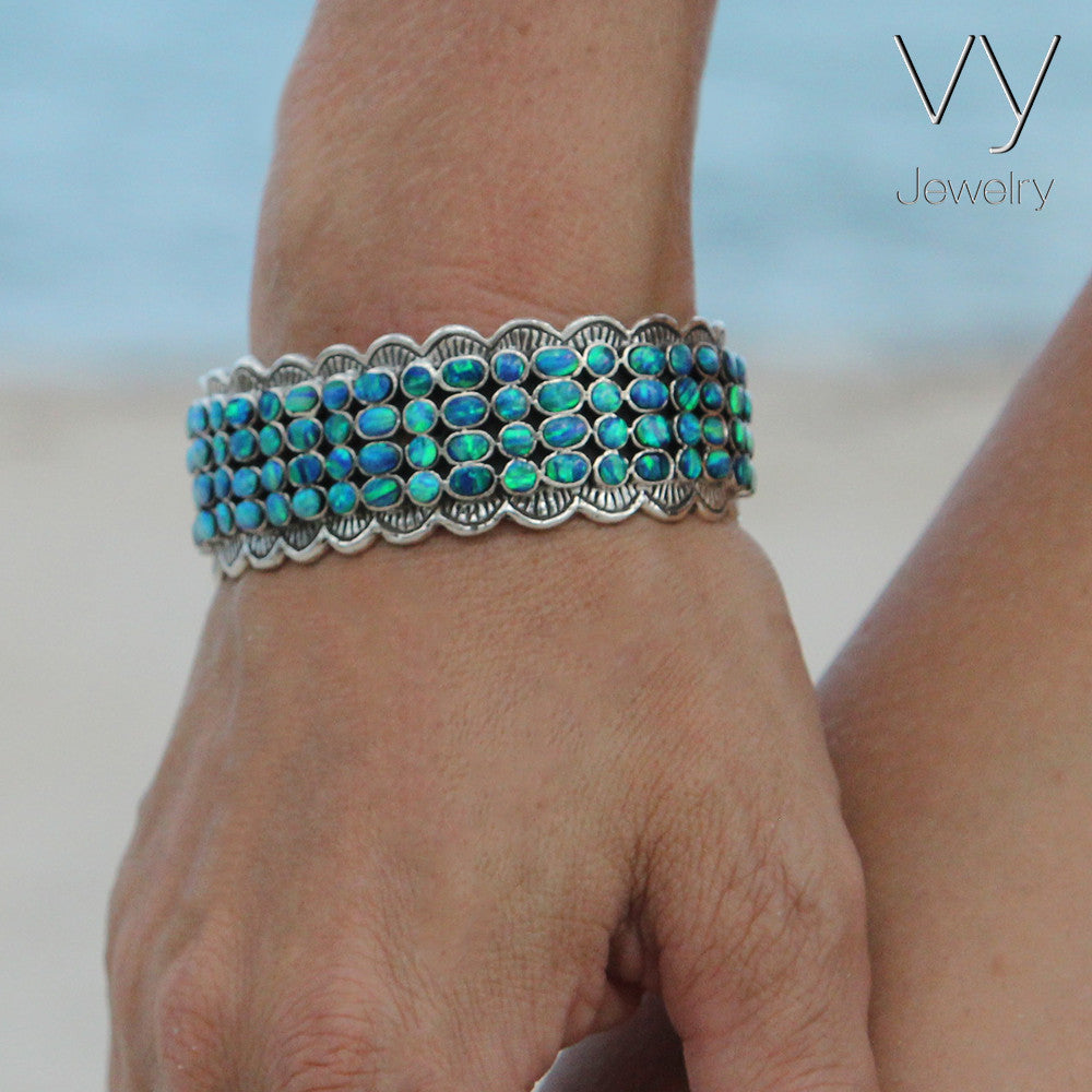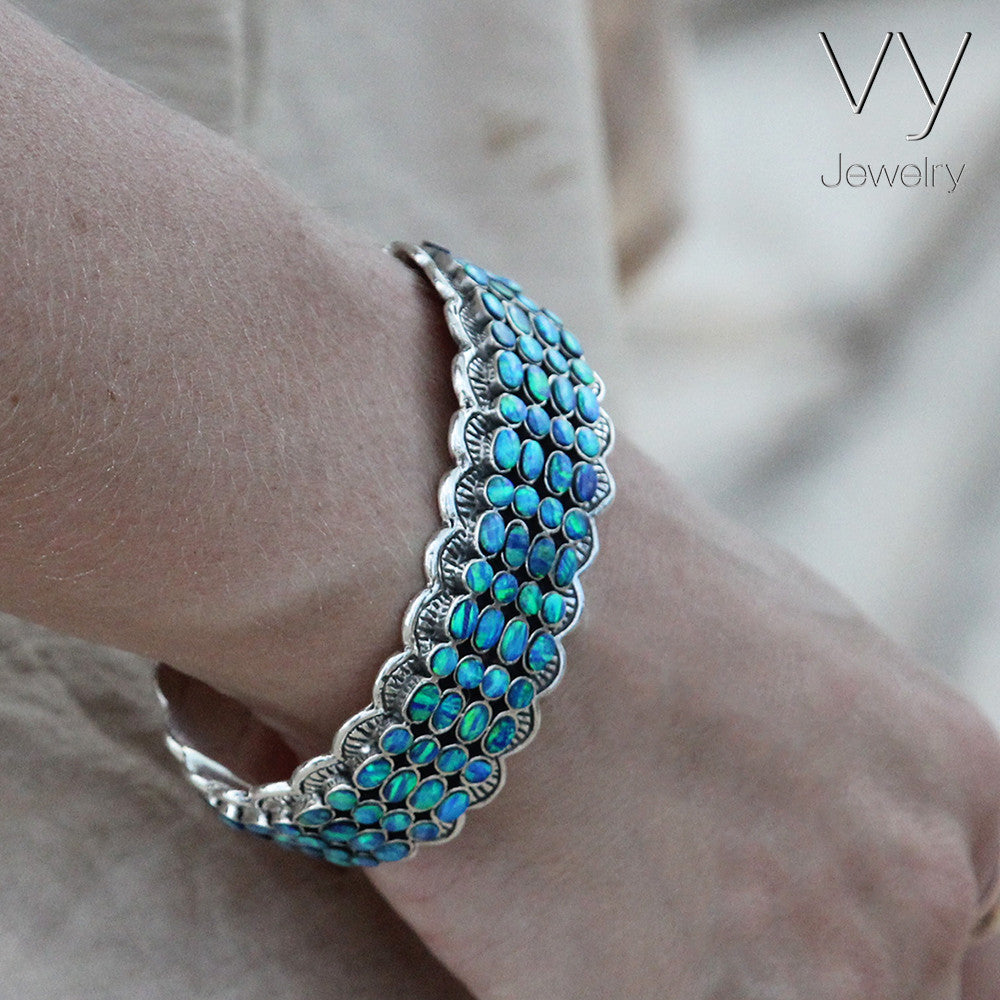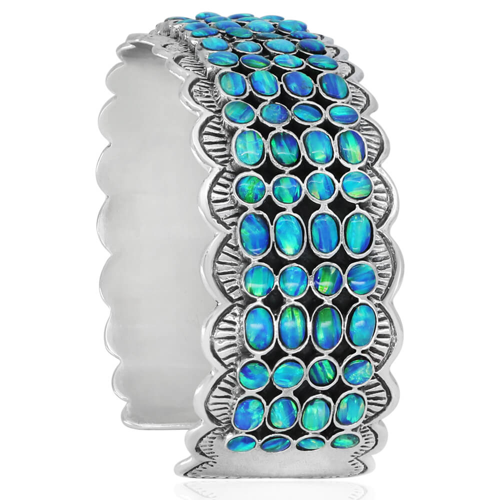 Stunning High-Quality Cuff Bracelet, made of Solid 925 Sterling Silver set with Genuine Blue Opal.