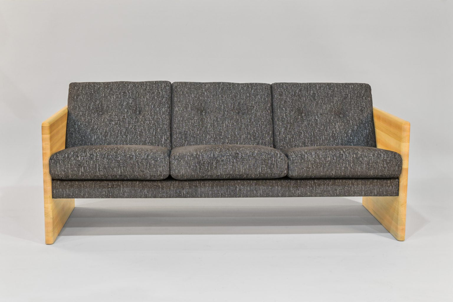 1.5” thick Maple Butcher Block arms display an organic finish, complementing the rich Deku Coal upholstery. Plush, button-tufted cushions provide cloud-like support as you unwind in style.