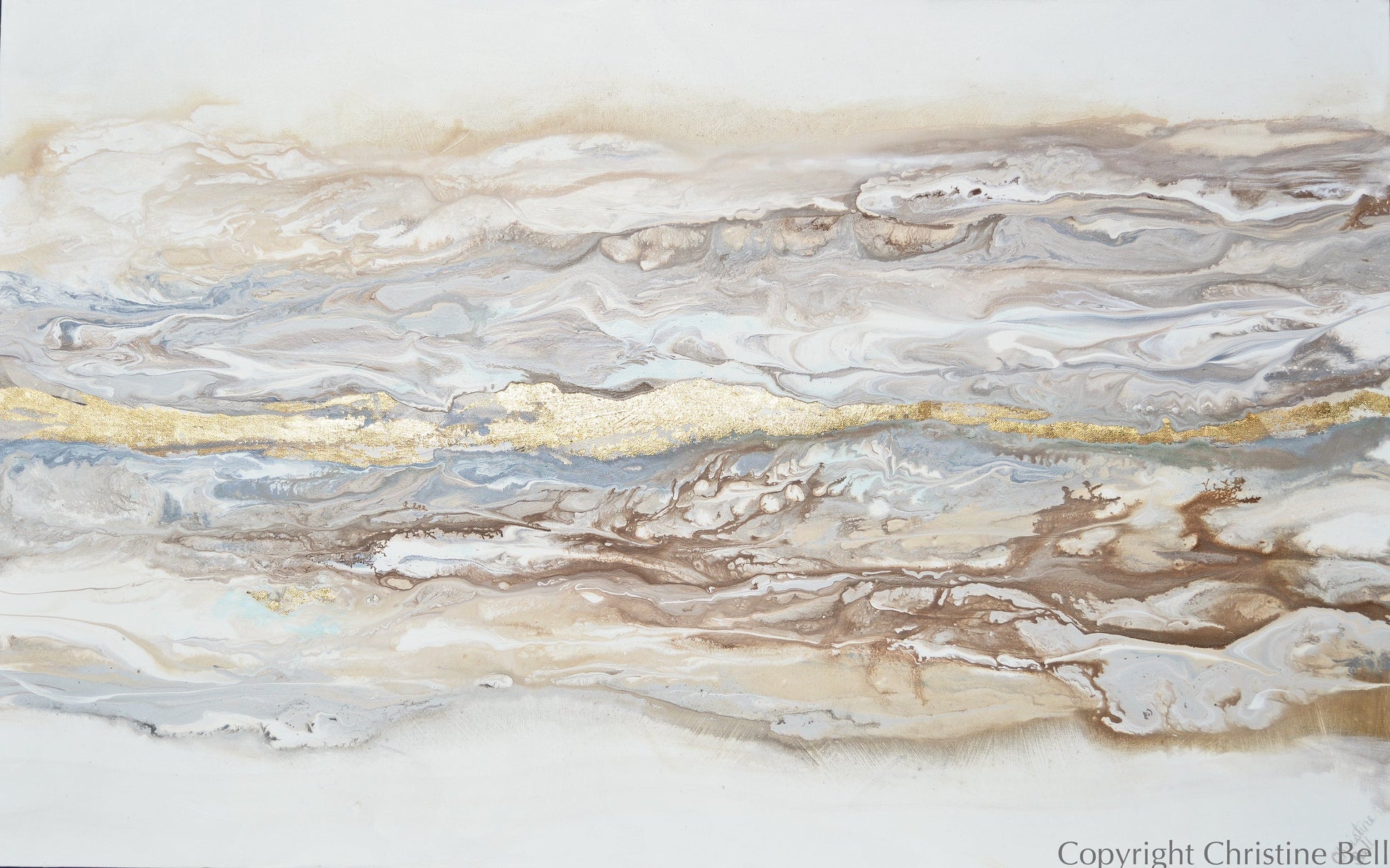 "Ingrained in My Soul" Giclée Print / Canvas Print Art Abstract Painting Nature Fine Art in neutral shades of white, grey, warm beige, light brown, taupe with stunning, reflective, metallic gold leaf. Contemporary, large, wall art, coastal home decor with a natural stone marbled effect giving this fine art piece a modern, authentic, organic feel. Modern painting with a calm, serene coastal feel of stone, earth and sea. Inspired by the pure colors, light and textures found within the California "Gold" Coast. This painting reflects both natural and directed light in such a way that it completely captures the viewer. Gallery wrapped canvas. THIS CANVAS CAN BE HUNG EITHER VERTICALLY OR HORIZONTALLY. Fine Art Print of an original piece of art created by internationally collected artist, Christine Bell, (formerly Christine Krainock).