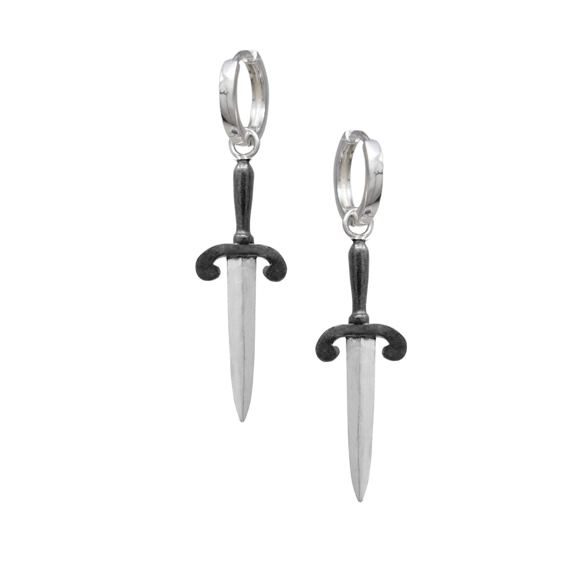 Our signature Armory Collection weaponry charms on a simple and sleek huggie earring. These huggies layer beautifully with other earrings, and can hold any of our house-made charms.