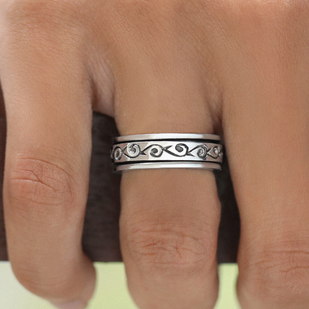 Spinner rings are two banded rings. They are also known as worry rings or meditation rings. One band of the rings stays in place while the other on the inside spins. These rings have magical powers that could cure tension while spinning.