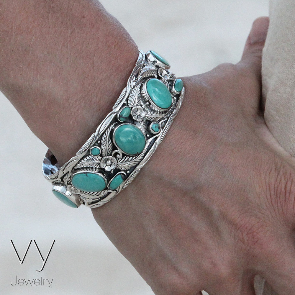 Impressive High-Quality Cuff Bracelet, made of 925 Sterling Silver set with Genuine Turquoise Stones.