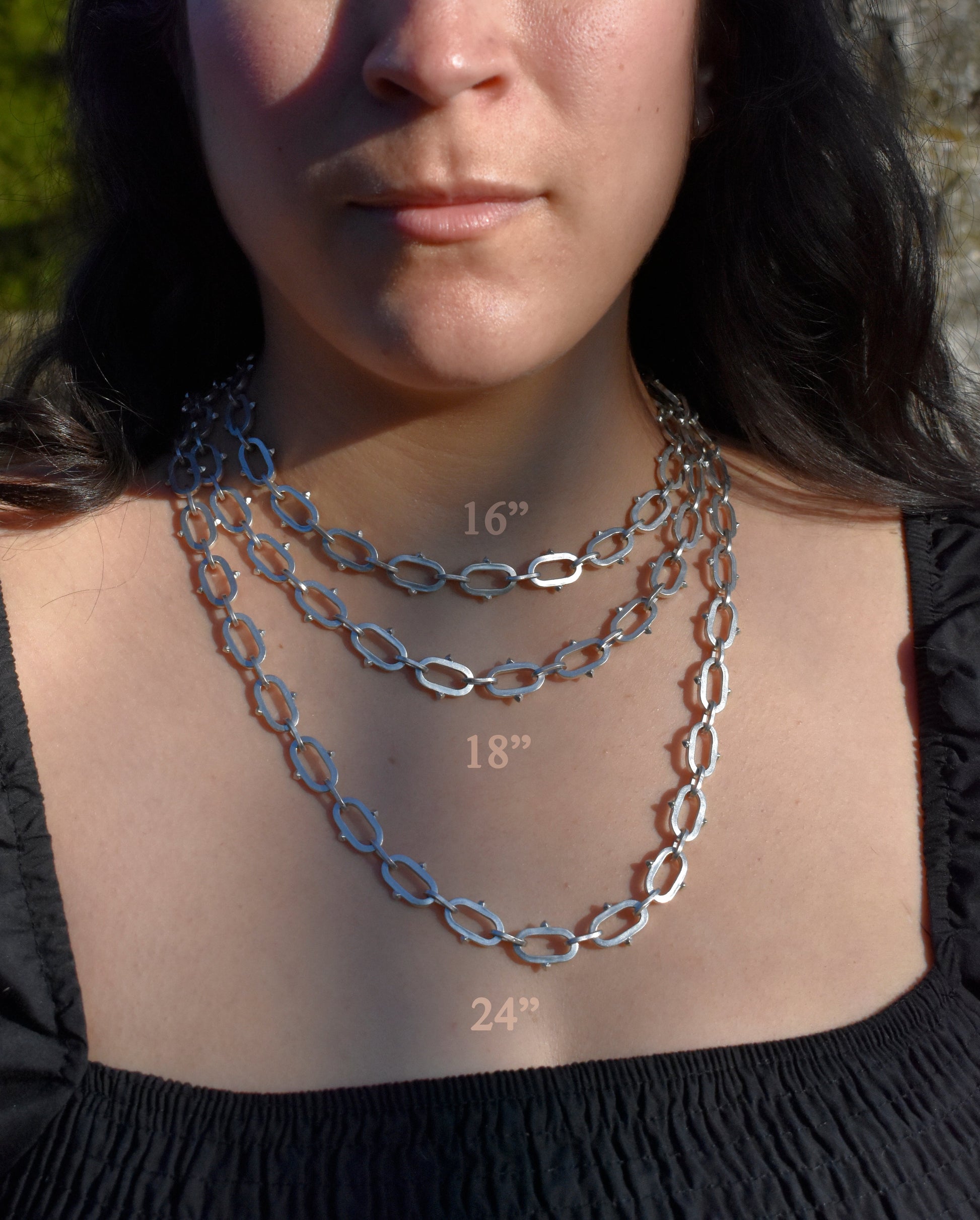 Chain Lengths: 16"(includes 2” of adjustable chain, adjusting down to 14"), 18", 20", 24", other lengths available by request.