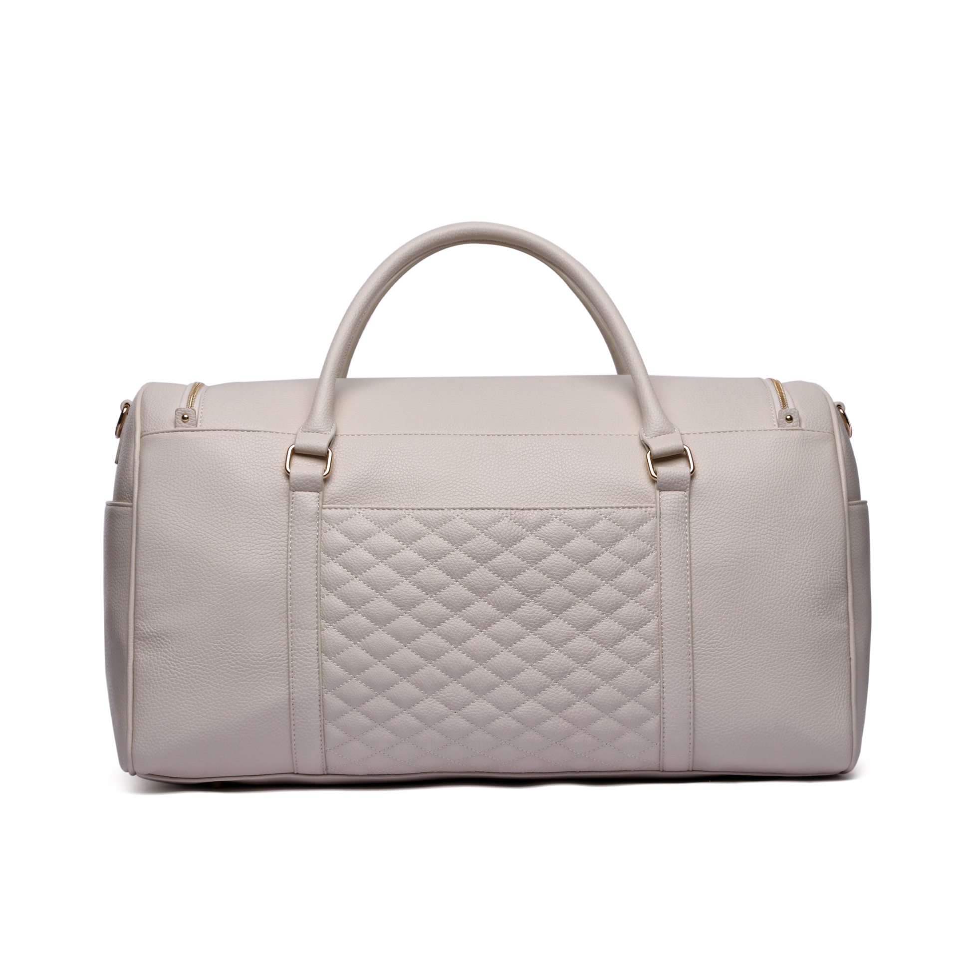 Experience luxury travel with this stunning pearl white weekender bag from Luli Bebé.